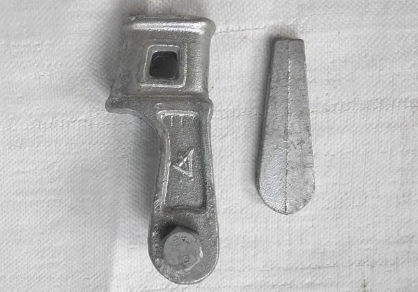 楔型并溝線材料一般為鍛鋁,由弓形本體和楔塊兩部分組成;安裝或拆卸均使用槍形專用工具,但不可重復(fù)使用。楔塊兩側(cè)邊的斜度與本體的斜度相同,可使導(dǎo)線在被接觸段內(nèi)均勻受力又可建立材料間的自鎖;弓形本體提供了為維持穩(wěn)定壓力所需的彈力。弓形本體內(nèi)槽的曲率半徑和楔塊外槽的半徑均略大于***大適用導(dǎo)線的半徑。在安裝時(shí),將被接續(xù)的兩根平直導(dǎo)線放入本體兩側(cè)的對(duì)應(yīng)位置,用人力將楔塊推至標(biāo)志線位,再擊發(fā)槍形專用工具,使之產(chǎn)生瞬間推力將楔塊壓入工作位。對(duì)楔塊的壓力主要由專用子彈中的藥量決定,減少了人為因素對(duì)安裝質(zhì)量的影響,所以楔型并溝線夾安裝的一致性較好。楔型并溝線夾可接續(xù)等徑和異徑的兩根導(dǎo)線。楔型并溝線夾對(duì)導(dǎo)線握力約為導(dǎo)線計(jì)算拉斷力的20%-45% 。